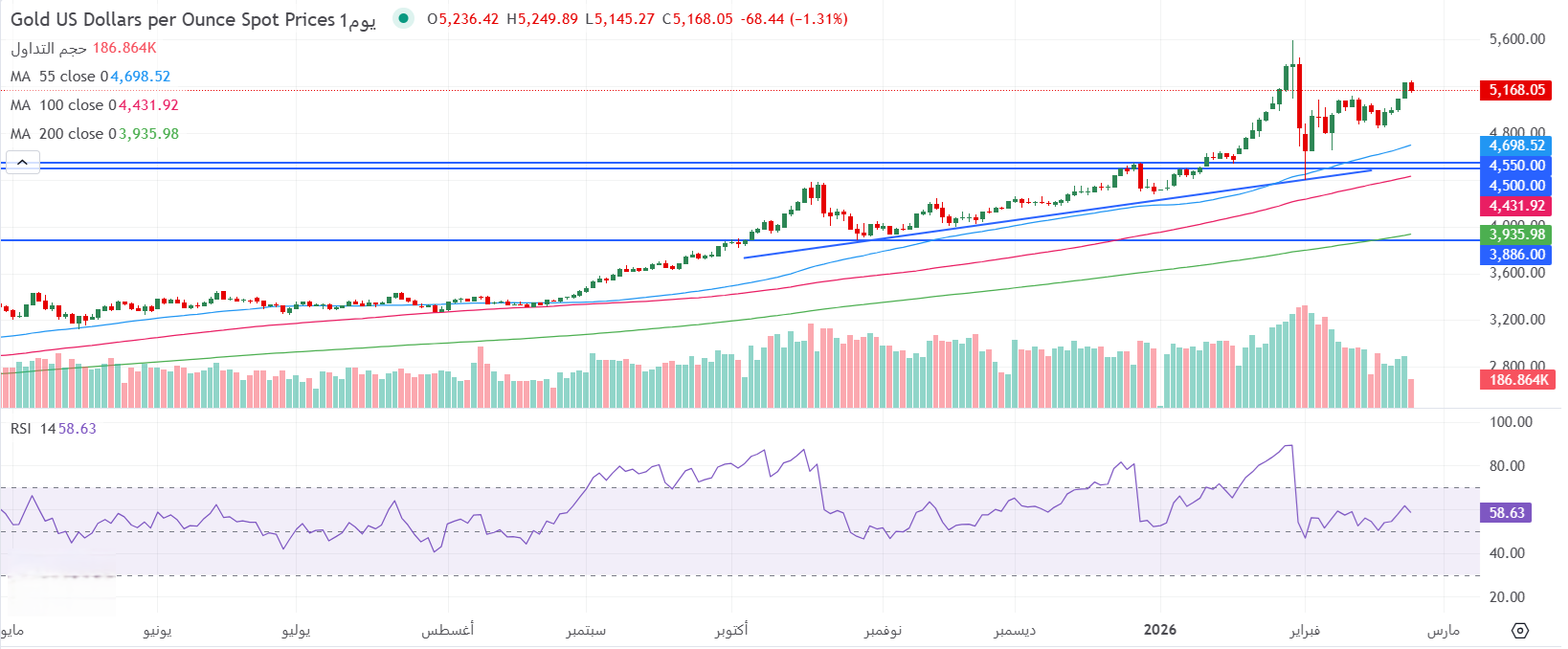 مناطق الدعم: 5120، 5000، 4916، 4842، 4655، 4550، 4500، 4402، 4274، 4163، 3998، 3928، 3886