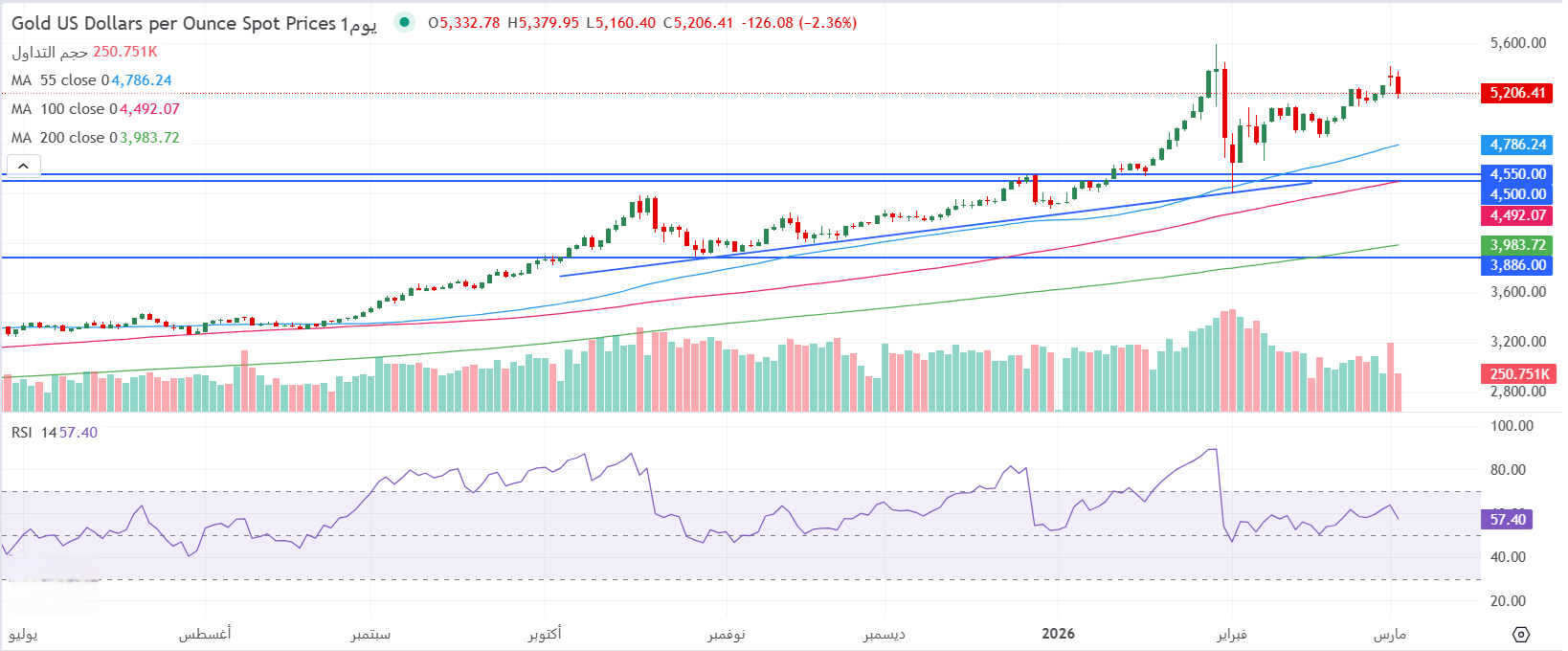 - يمدد الذهب في الأسواق العالمية الانخفاض في وقت مبكر اليوم من أعلى مستوياته خلال ما يقرب من 5 أسابيع عند محيط منطقة 5420 دولار للأونصة المسجلة يوم أمس، حيث يترقب تطورات الحرب بين الولايات المتحدة وإسرائيل وإيران من أجل محاولة اكتساب الزخم الكافي للارتداد وتحدي واختراق أعلى المستويات على الإطلاق عند محيط منطقة 5598 دولار للأونصة.