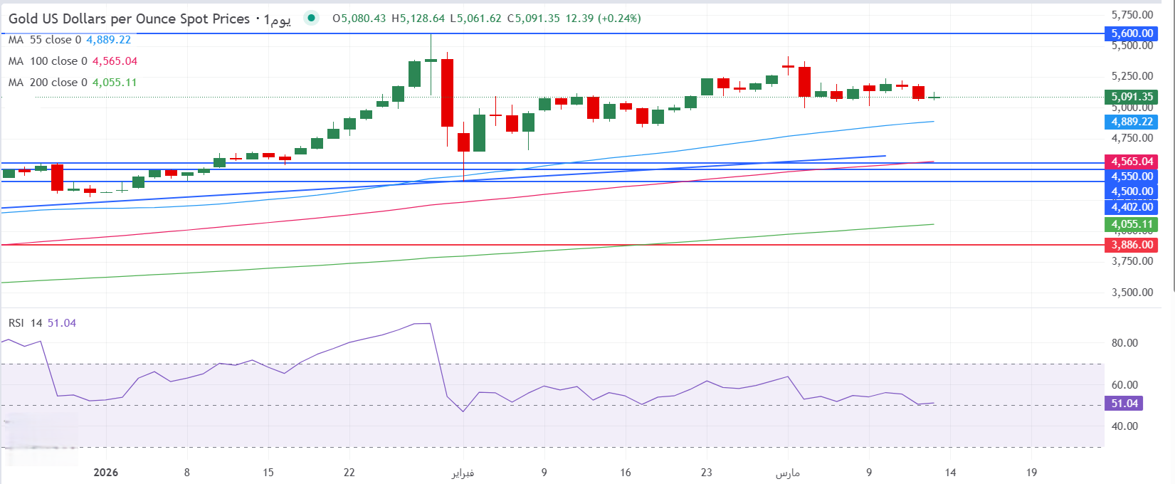- على الرغم من التقلبات الشديدة في أسعار الذهب في الأسواق العالمية منذ أواخر يناير/كانون الثاني 2026، يحافظ المعدن الأصفر على الاتجاه الصاعد الرئيسي ويتداول فوق جميع المتوسطات المتحركة اليومية الرئيسية الصاعدة، متداولاً عند محيط منطقة 5091 دولار للأونصة، وذلك مع استمرار تحرك مؤشر القوة النسبية RSI بإعدادات 14 يوماً بشكل عرضي ضمن مناطق صعودية حول مستويات 51، أعلى بقليل من خط 50 المحايد في وقت كتابة هذا التقرير.