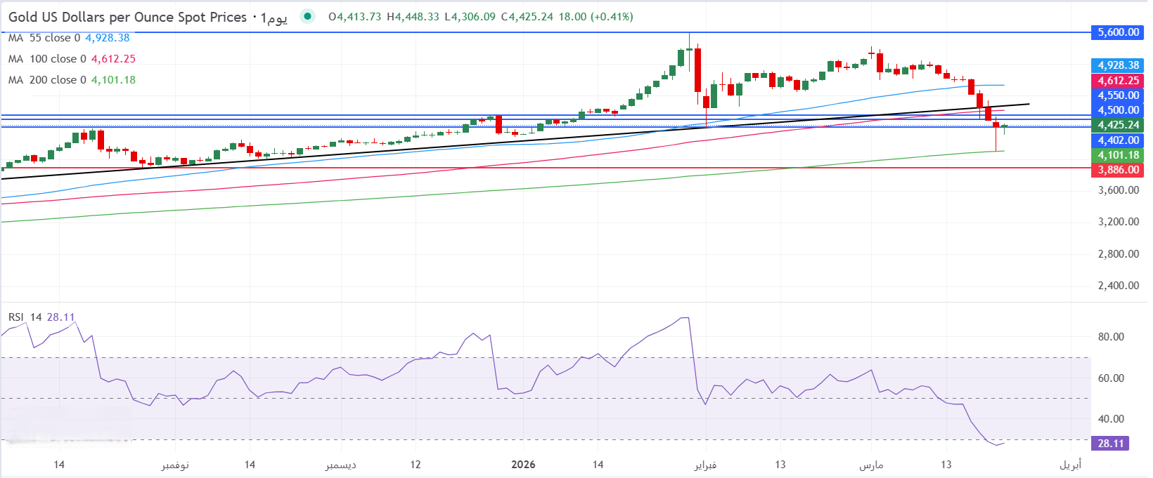 - يتم تداول الذهب في الأسواق العالمية على ارتفاع طفيف عند محيط منطقة 4425 دولار للأونصة، وذلك مع تحرك مؤشر القوة النسبية RSI بإعدادات 14 يوماً حول مستويات 28، ضمن مناطق تشبع بيعي في وقت كتابة هذا التقرير، مما يحفز الآمال في تسجيل ارتفاع تصحيحي محدود.