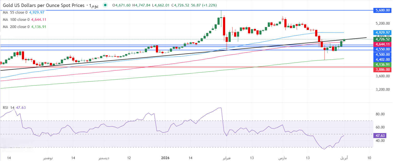 - يتم تداول الذهب في الأسواق العالمية على ارتفاع عند محيط منطقة 4726 دولار للأونصة، وذلك على خلفية تمديد ارتداد مؤشر القوة النسبية RSI بإعدادات 14 يوماً من مناطق التشبع البيعي ضمن مناطق صعودية عند محيط مستويات 48، مقترباً من خط المنتصف 50 في وقت كتابة هذا التقرير.