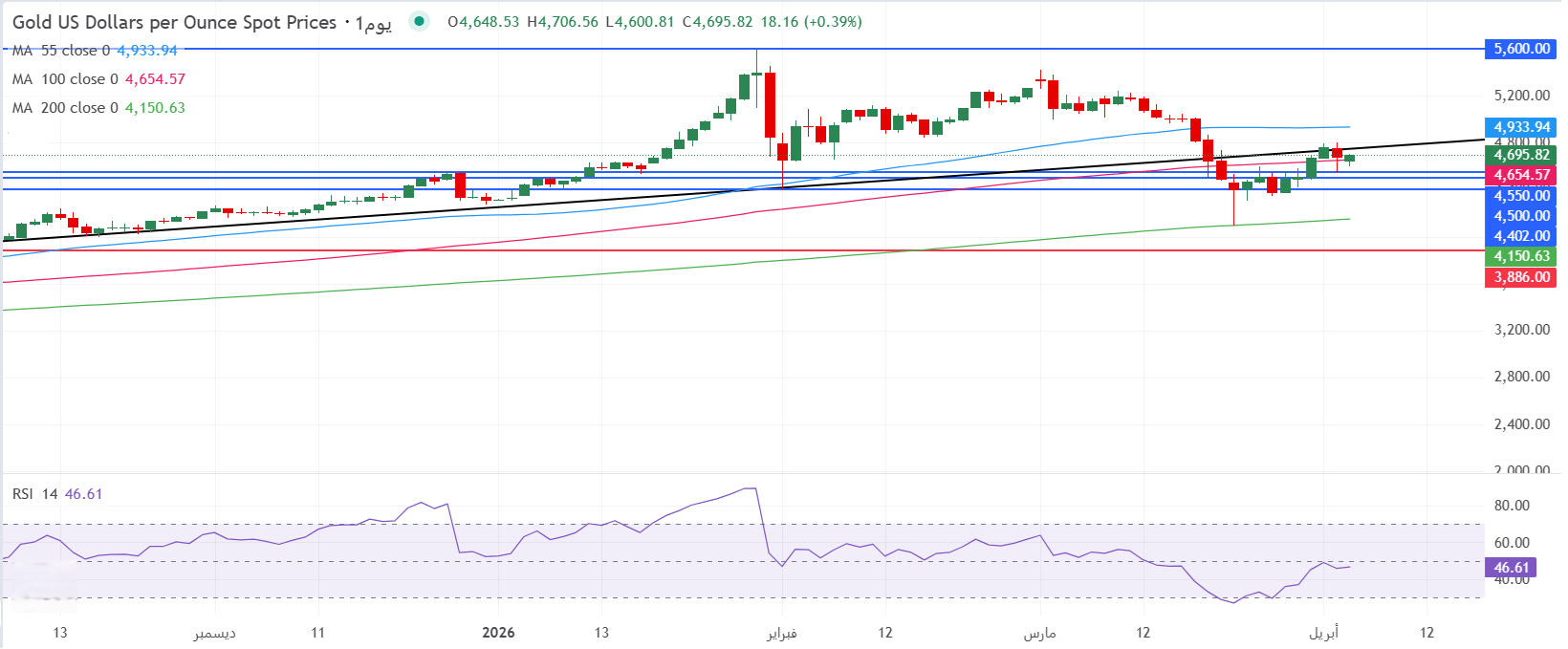 - يتم تداول الذهب في الأسواق العالمية على ارتفاع عند محيط منطقة 4695 دولار للأونصة، وذلك على خلفية تذبذب مؤشر القوة النسبية RSI بإعدادات 14 يوماً أدنى بقليل من خط المنتصف 50 ضمن مناطق هبوطية عند محيط مستويات 46 في وقت كتابة هذا التقرير.