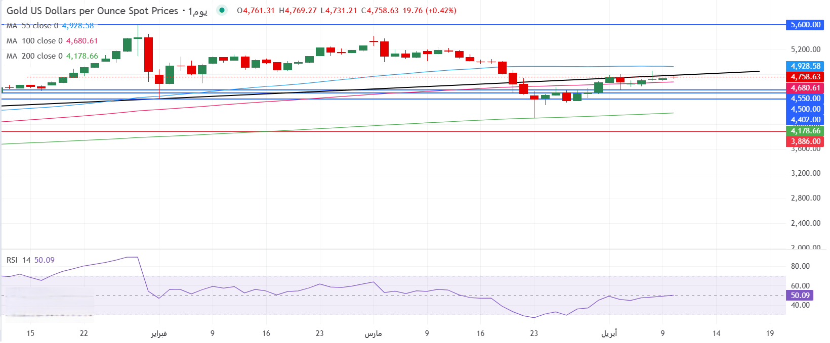 - يتم تداول الذهب في الأسواق العالمية بشكل عرضي فاتر عند محيط منطقة 4758 دولار للأونصة، وذلك على خلفية تذبذب مؤشر القوة النسبية RSI بإعدادات 14 يوماً حول خط المنتصف 50 في وقت كتابة هذا التقرير.