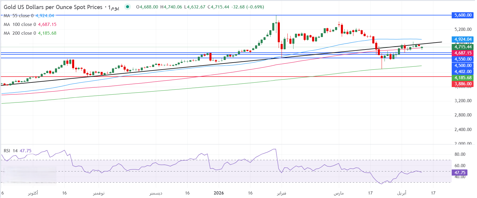 - يتم تداول الذهب في الأسواق العالمية بشكل عرضي داخل نطاق سعري ضيق عند محيط منطقة 4715 دولار للأونصة، وذلك على خلفية تذبذب مؤشر القوة النسبية RSI بإعدادات 14 يوماً حول خط المنتصف 50 في وقت كتابة هذا التقرير.