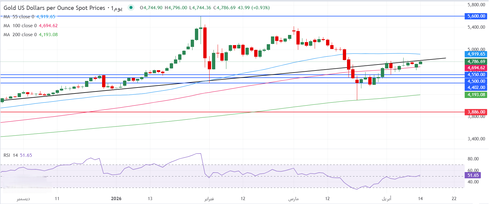 - يرتد الذهب في الأسواق العالمية ضمن نطاق سعري عرضي أوسع نطاقاً عند محيط منطقة 4786 دولار للأونصة، وذلك على خلفية دخول مؤشر القوة النسبية RSI بإعدادات 14 يوماً ضمن المناطق الصعودية فوق خط المنتصف 50، حيث يتحرك عند محيط مستويات 51 في وقت كتابة هذا التقرير.