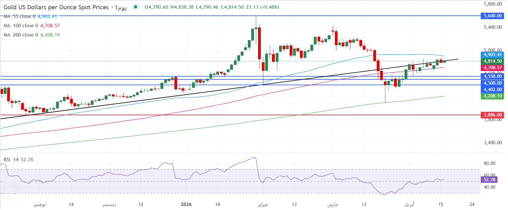 يقلص زوج الذهب/الدولار XAU/USD انخفاض يوم أمس جزئياً، مرتفعاً بشكل طفيف إلى محيط منطقة 4814 دولار للأونصة في وقت كتابة هذا التقرير.