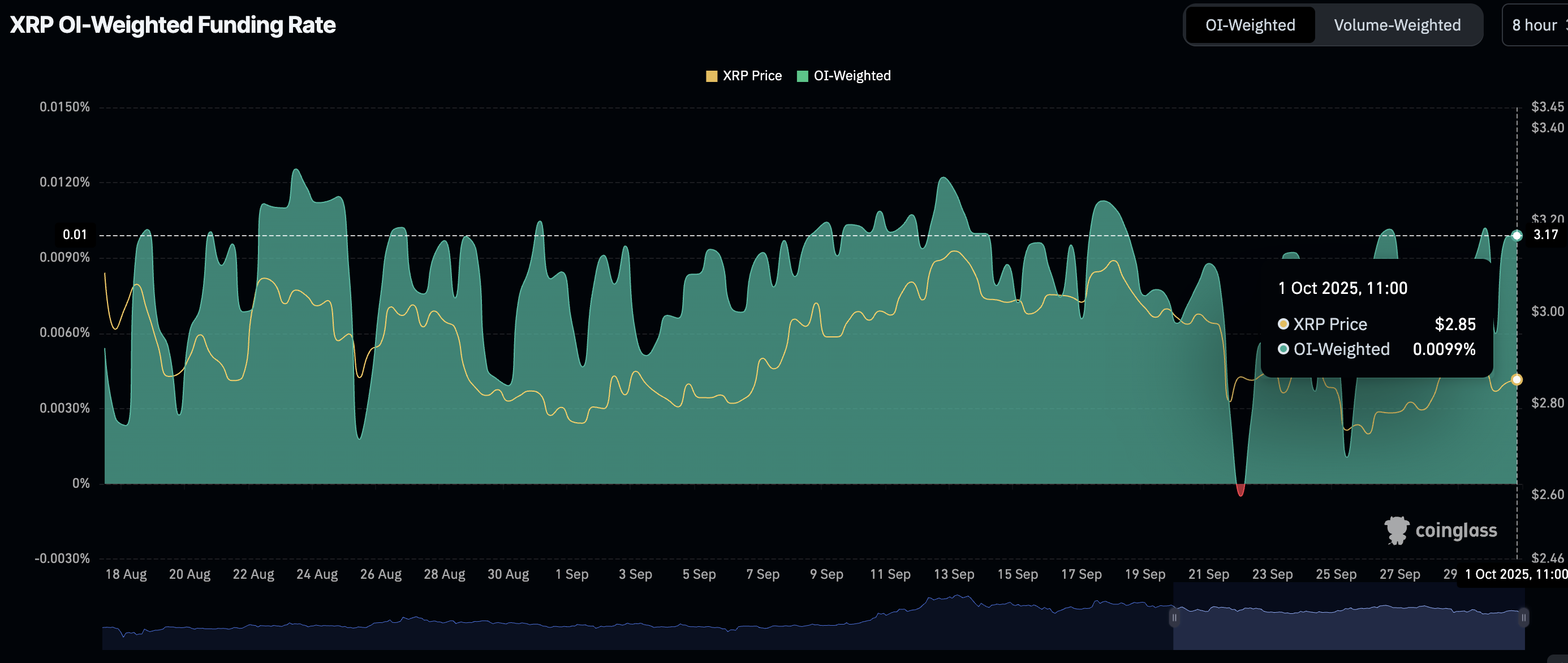 حدث الارتفاع في السعر بالتزامن مع زيادة ملحوظة في اهتمام التجزئة في رمز تحويل الأموال عبر الحدود. يتزايد عدد متداولي عقود XRP الآجلة الذين يدخلون في مراكز شراء، وفقًا لبيانات CoinGlass حول معدل التمويل الموزون بالاهتمام المفتوح (OI)، الذي يبلغ متوسطه 0.0099%، مرتفعًا من 0.0011% يوم الجمعة الماضي.