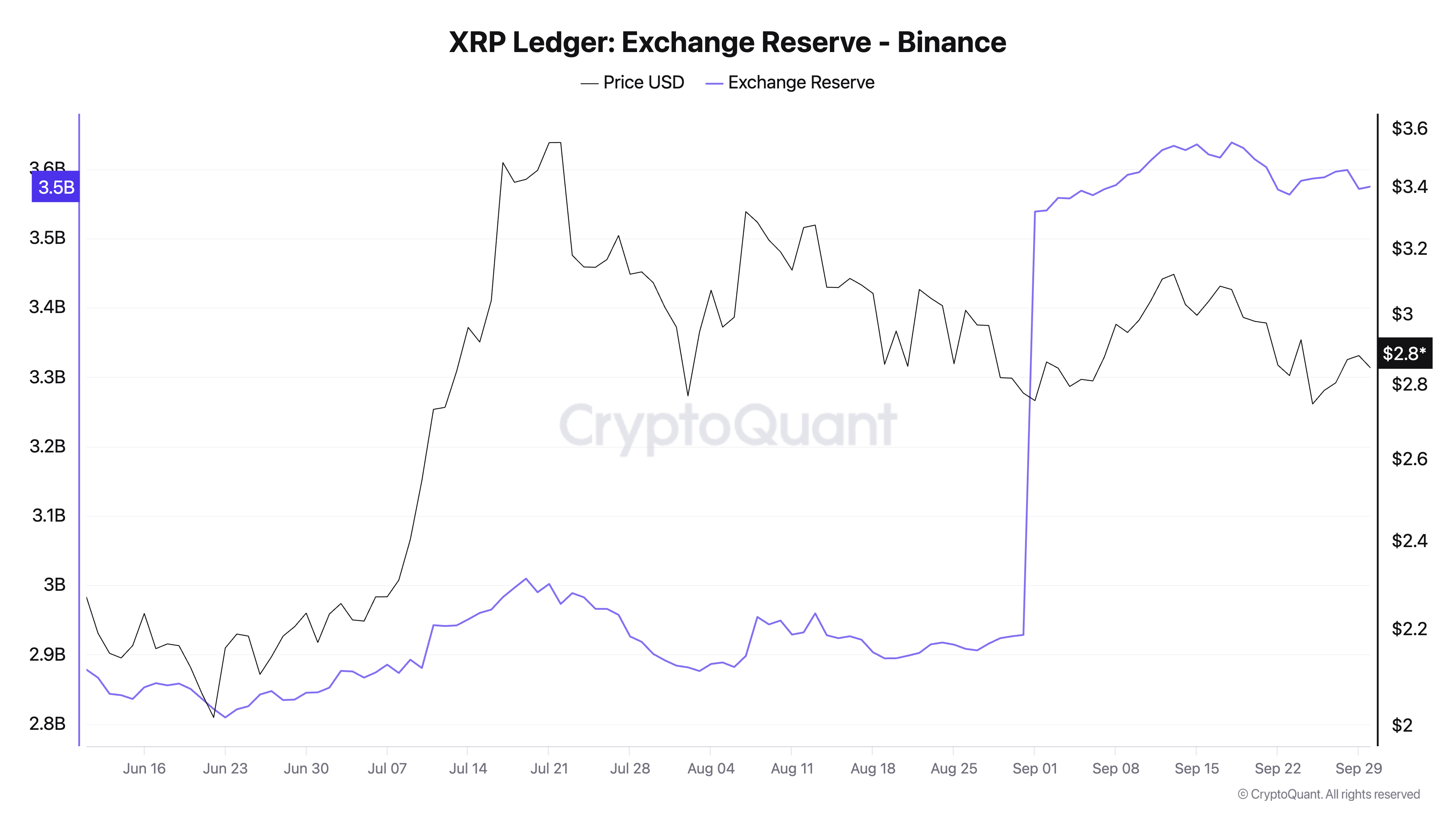 على الجانب الآخر، تشير أنشطة Binance إلى أن المستثمرين قد أبطأوا من تحويل الأصول إلى البورصة. تظهر بيانات CryptoQuant أن رصيد الرمز على Binance يبلغ حوالي 3.57 مليار XRP، مستقرًا بعد زيادة كبيرة من 2.92 مليار XRP في 31 أغسطس.