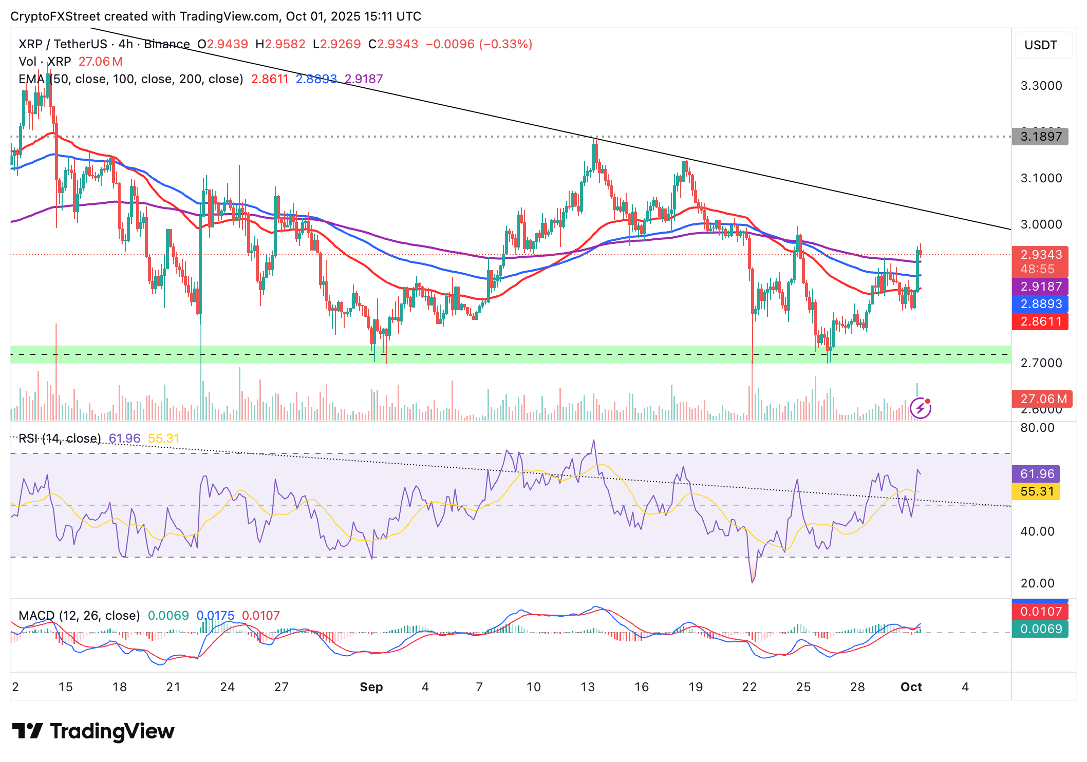 تكتسب XRP زخمًا فوق المتوسطات المتحركة الرئيسية، بما في ذلك المتوسط المتحرك الأسي لمدة 200 فترة عند 2.91 دولار، والمتوسط المتحرك الأسي لمدة 100 فترة عند 2.88 دولار، والمتوسط المتحرك الأسي لمدة 50 فترة عند 2.86 دولار على الرسم البياني لمدة 4 ساعات، مدعومة بمشاعر صعودية في سوق العملات المشفرة الأوسع.