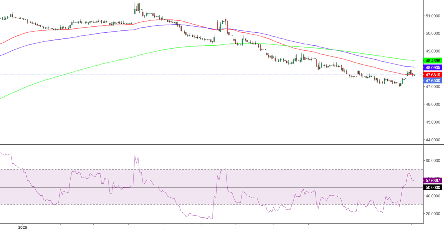 كريدي أجريكول: 47.59 جنيه للشراء، 47.69 جنيه للبيع.