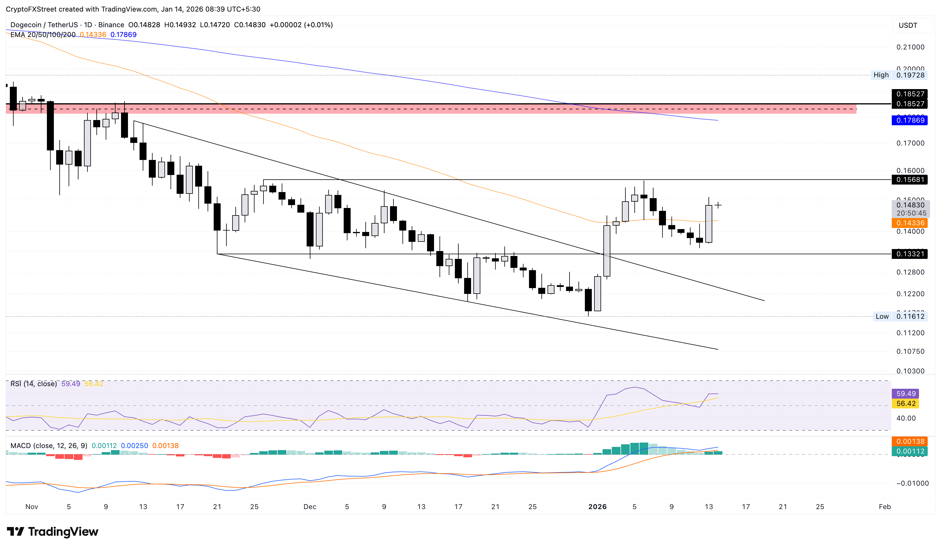 If DOGE reverses from $0.1500, it could retest the $0.1332 support marked by the November 21 low.