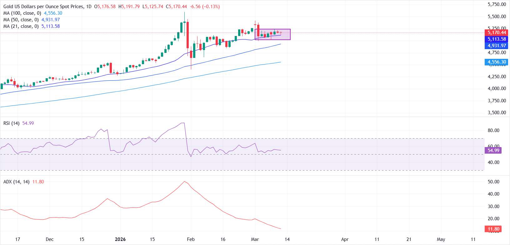 Technical analysis: XAU/USD trades sideways between $5,000 and $5,250