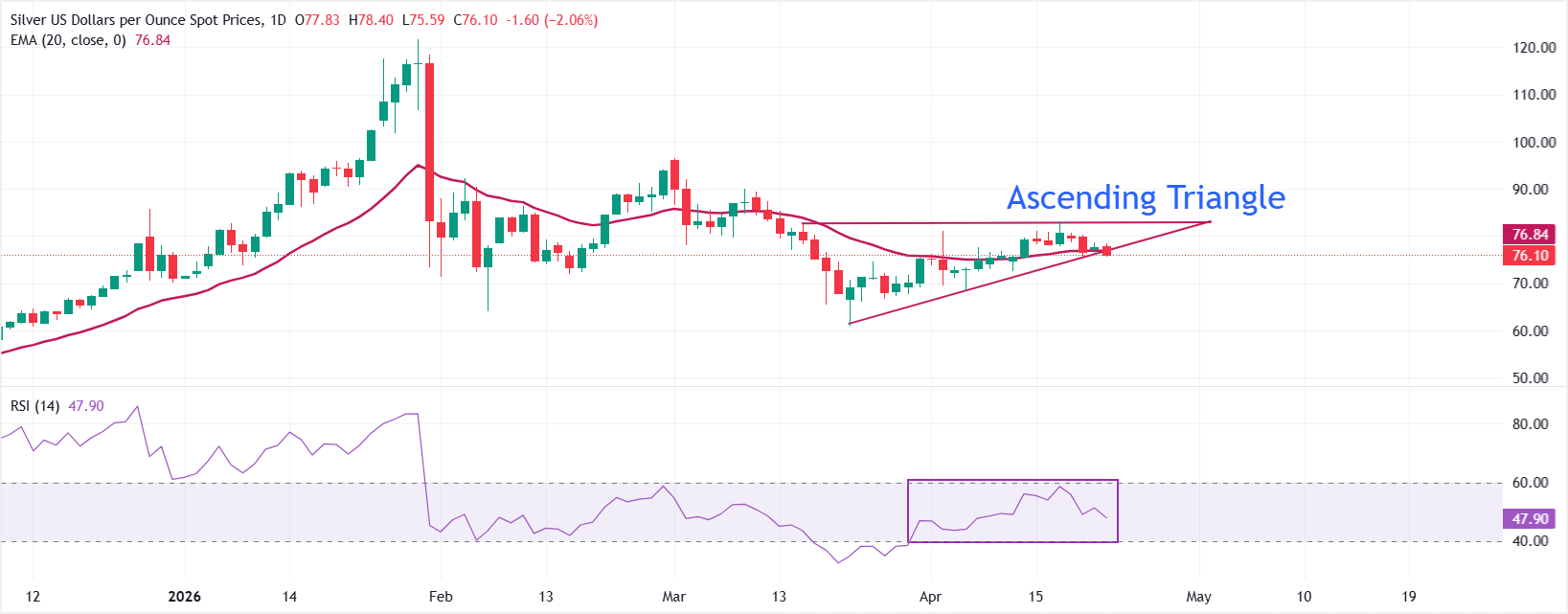 XAG/USD trades lower at around $76 as of writing. The overall trend of the white metal appears to be uncertain as it is on the verge of an Ascending Triangle breakdown. The 20-day Exponential Moving Average (EMA) at $76.84 caps the upside as immediate resistance.