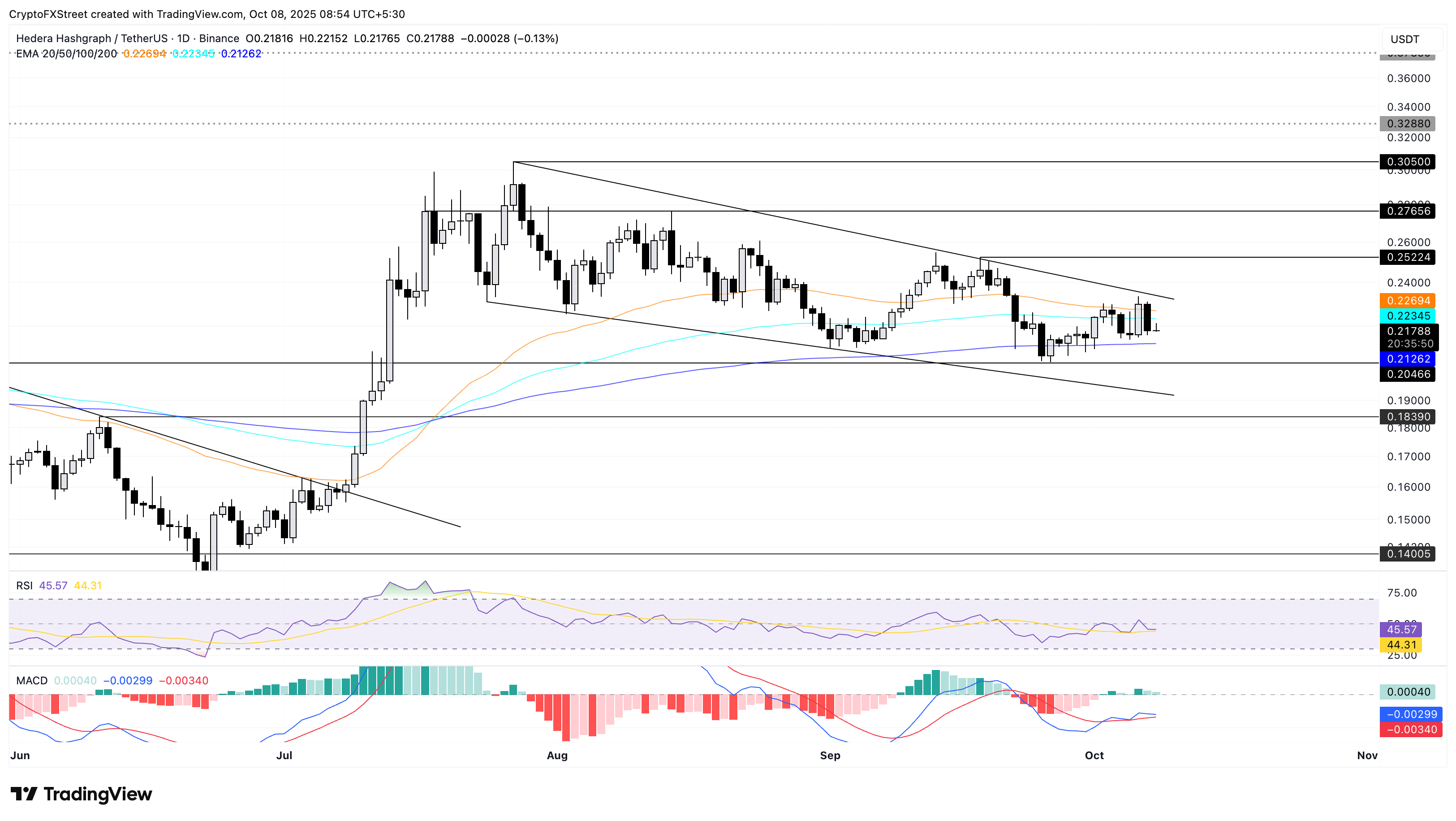 On the other hand, Hedera extends movement within a falling channel pattern on the daily chart, reversing from the overhead resistance trendline by 5% on Tuesday. At the time of writing, HBAR holds above the 200-day EMA at $0.2126 on Wednesday, struggling to avoid a further decline.