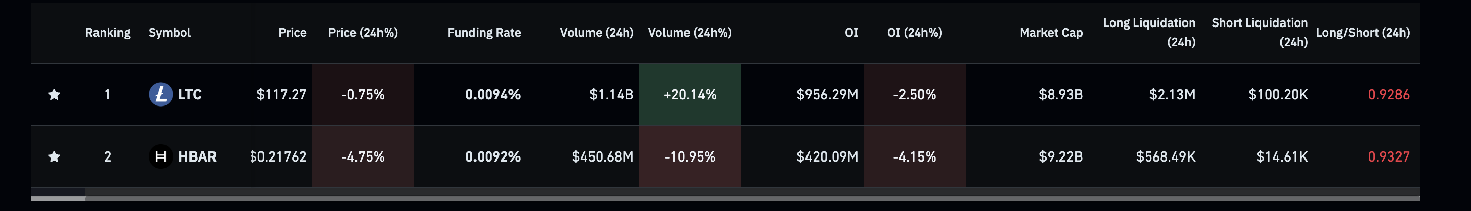 Litecoin and Hedera derivatives data. Source: CoinGlass