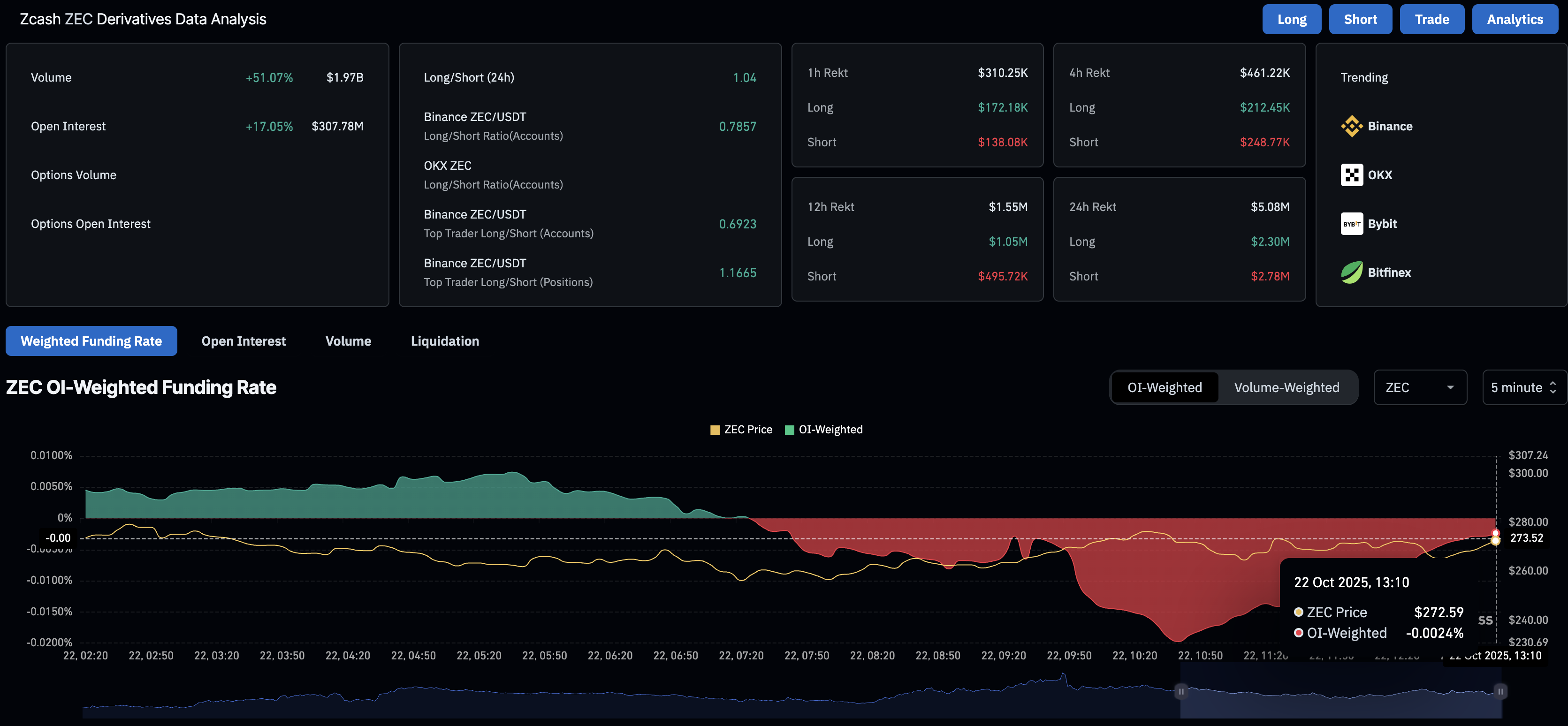 Apart from on-chain demand, the retail demand for ZEC is also on the rise as traders anticipate further recovery. CoinGlass data shows that the ZEC futures Open Interest (OI) has increased by 17.05% in the last 24 hours, reaching $307.78 million. An increase in OI refers to a rise in the notional value of all outstanding ZEC futures contracts, suggesting a risk-on sentiment shift to the privacy coin while the broader market suffers from liquidation waves.