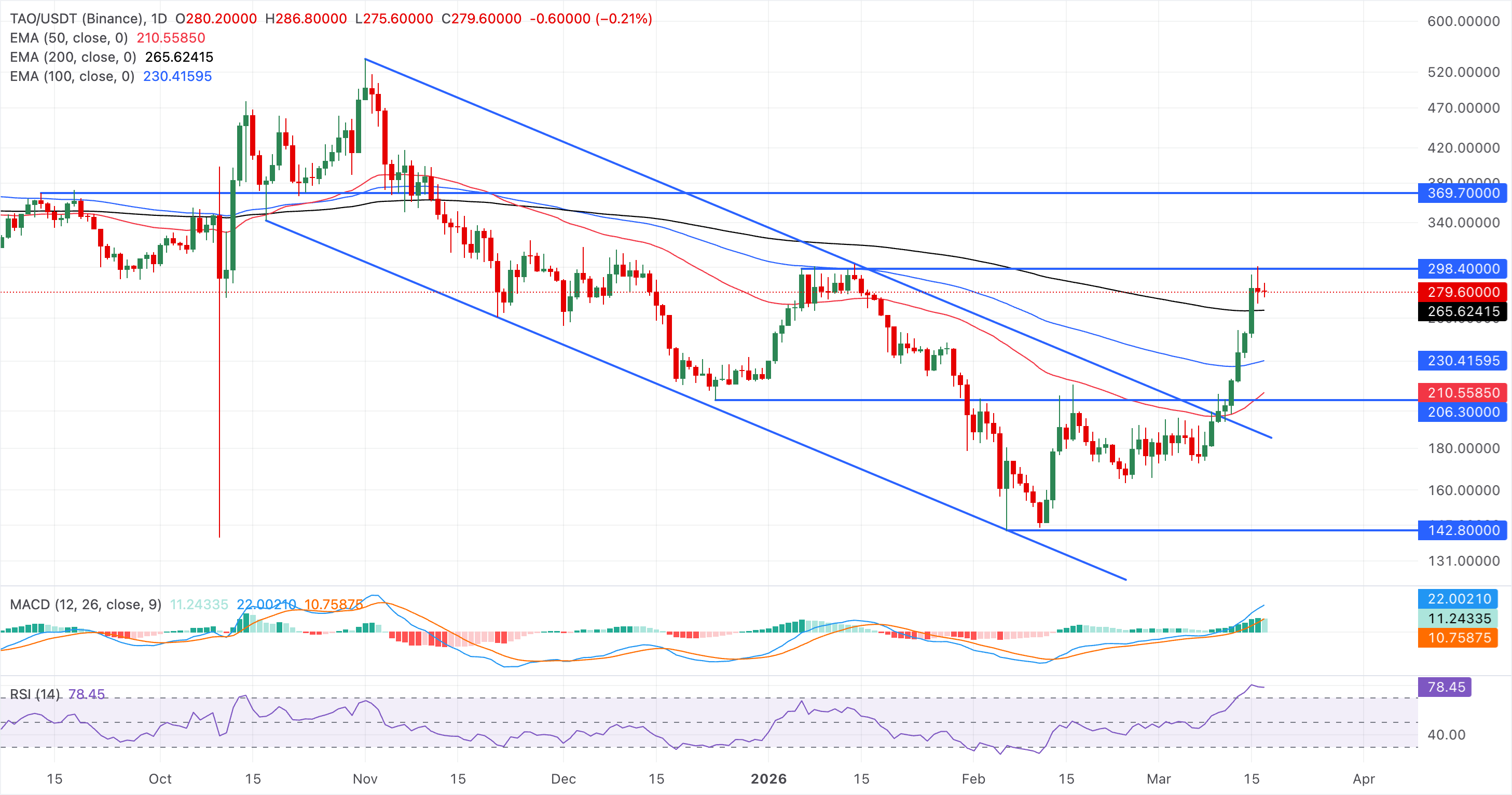 Bittensor hovers around $280 at press time on Tuesday, holding steady so far this week after a 55% rally in the previous one. The AI token now trades well above the 50-, 100-, and 200-day EMAs, which have begun to turn higher and are aligning in support of an emerging uptrend.