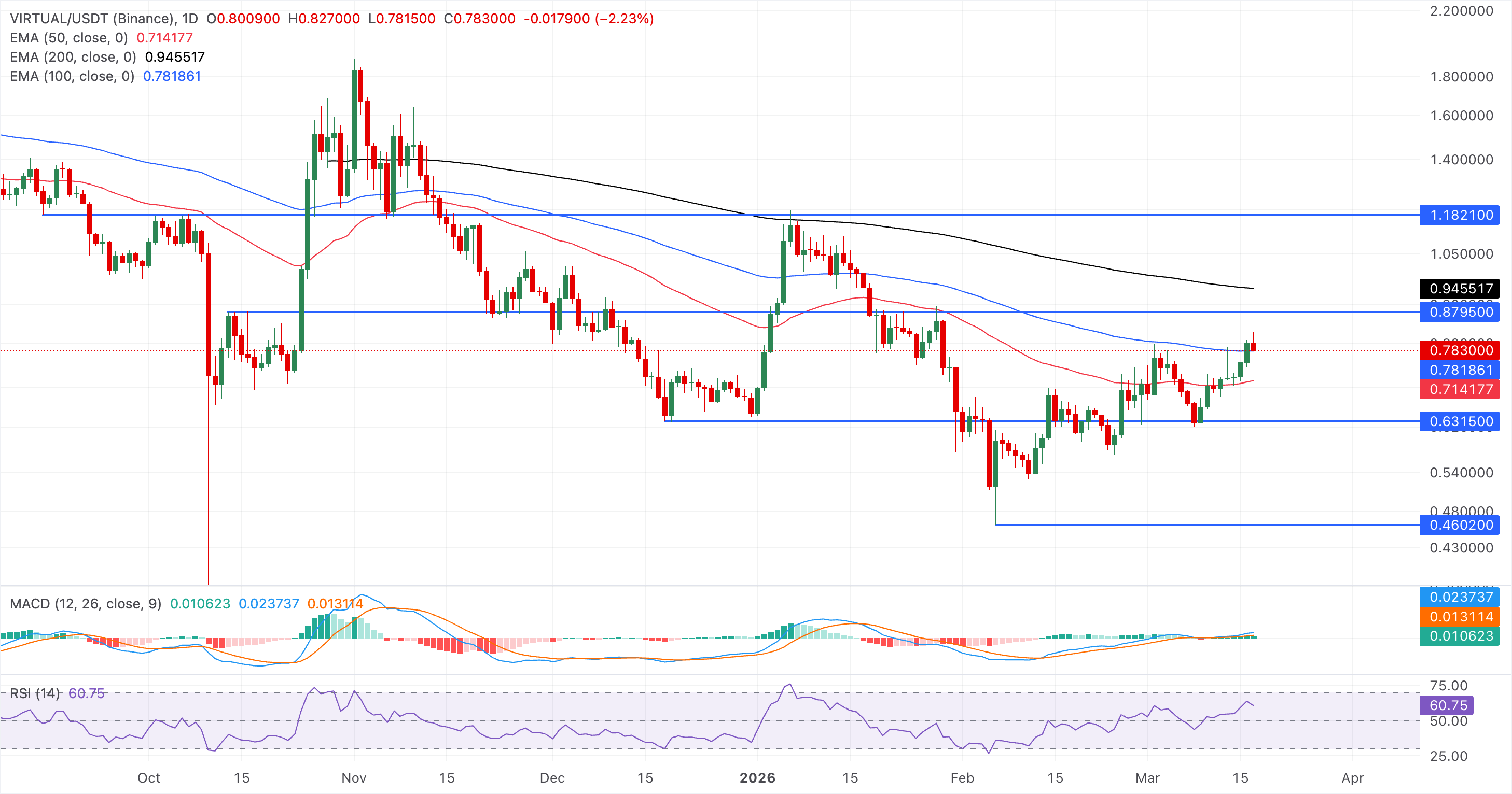 Virtuals Protocol is down 2% at the time of writing on Tuesday, after five consecutive days of recovery. The near-term bias is mildly bullish as price holds above the 50-day EMA near $0.7141, while testing the 100-day EMA at $0.7818, framing an emerging recovery within a broader downbeat backdrop defined by the 200-day average near $0.9455.