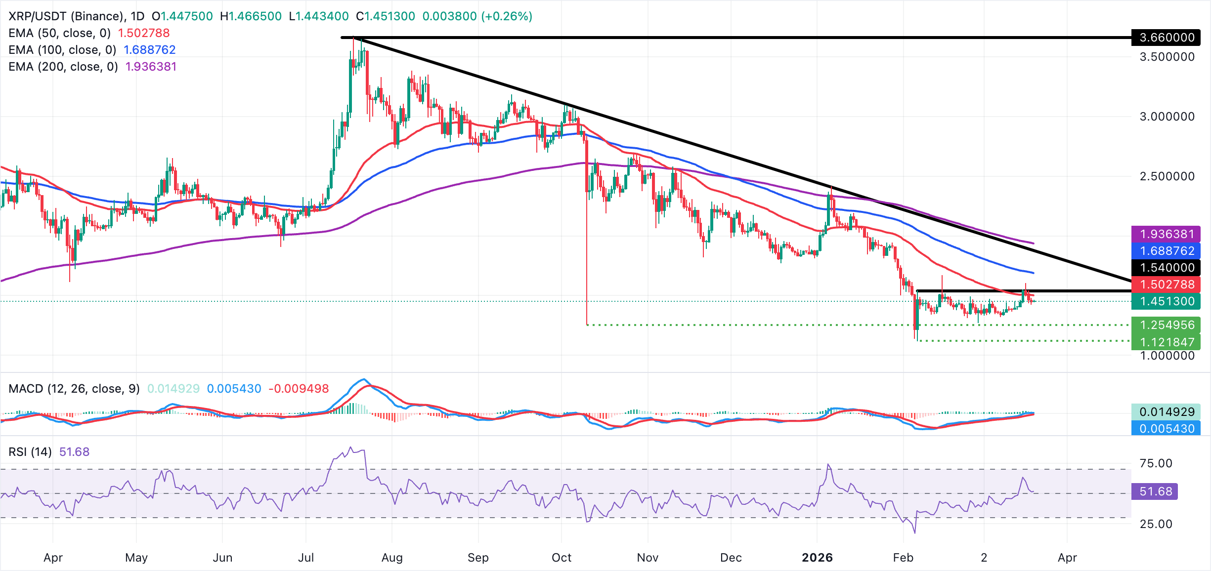 XRP is trading above $1.45, up slightly from the daily open. The near-term bias is neutral, with a mild upside tilt, after the token rebounded from Thursday's low at $1.42, but it remains capped well below the long-standing descending resistance trend line, which remains unbroken since July.