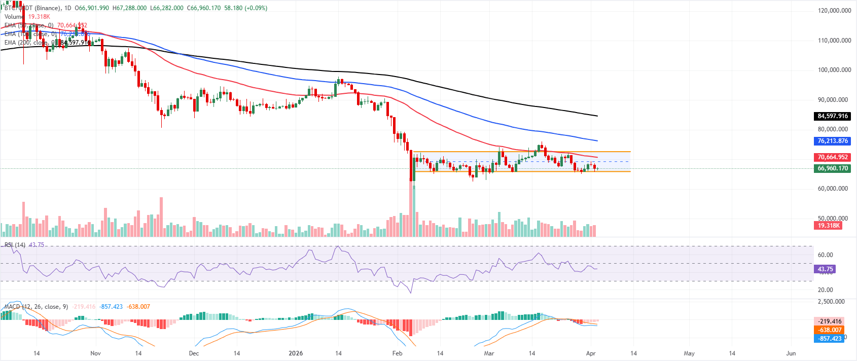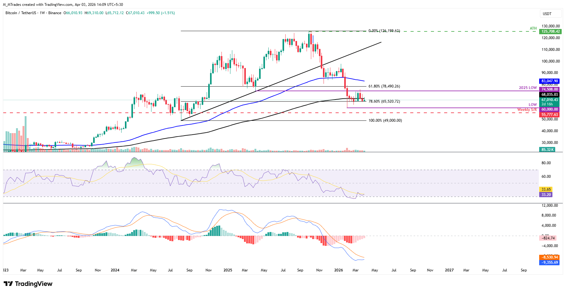As seen on the weekly chart below, the largest cryptocurrency by market capitalization faced rejection around the 2025 yearly low of $74,508 in mid-March. It declined slightly, closing below the 200-week Exponential Moving Average (EMA) at $68,031. As of this week, BTC has been rejected by the 200-week EMA and trades at $67,000 on Friday.