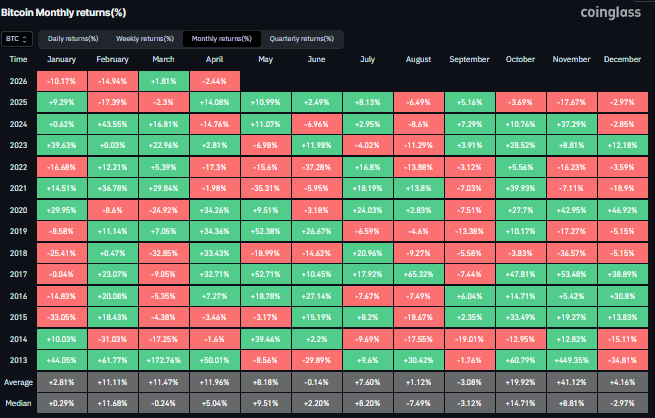 Bitcoin monthly returns (%) chart. Source: Coinglass