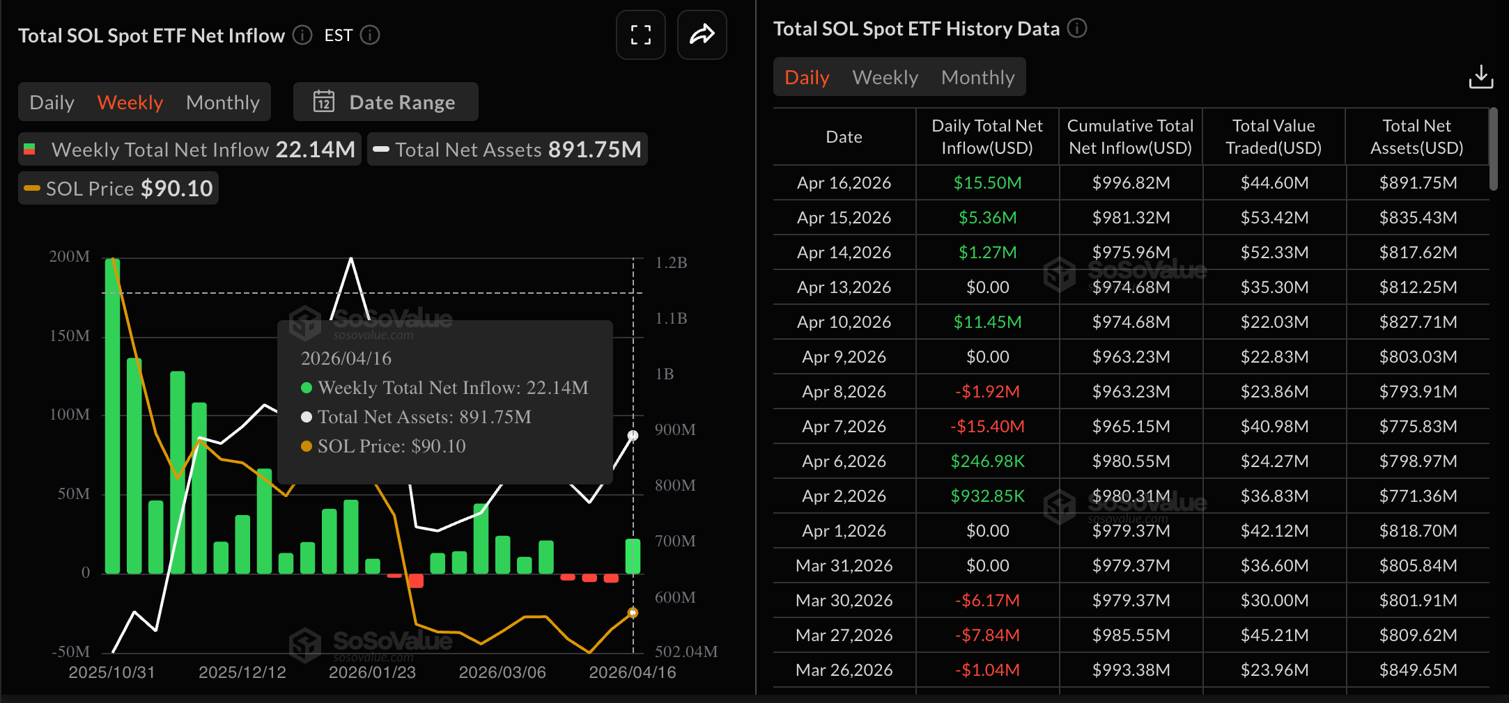 Solana is regaining momentum in the leverage market, aligning with the renewed institutional interest. The Sosovalue data shows $15.50 million in inflows into SOL-focused Exchange Traded Funds (ETFs) on Thursday, marking the third consecutive daily inflow this week and bringing the total to $22.14 million.
