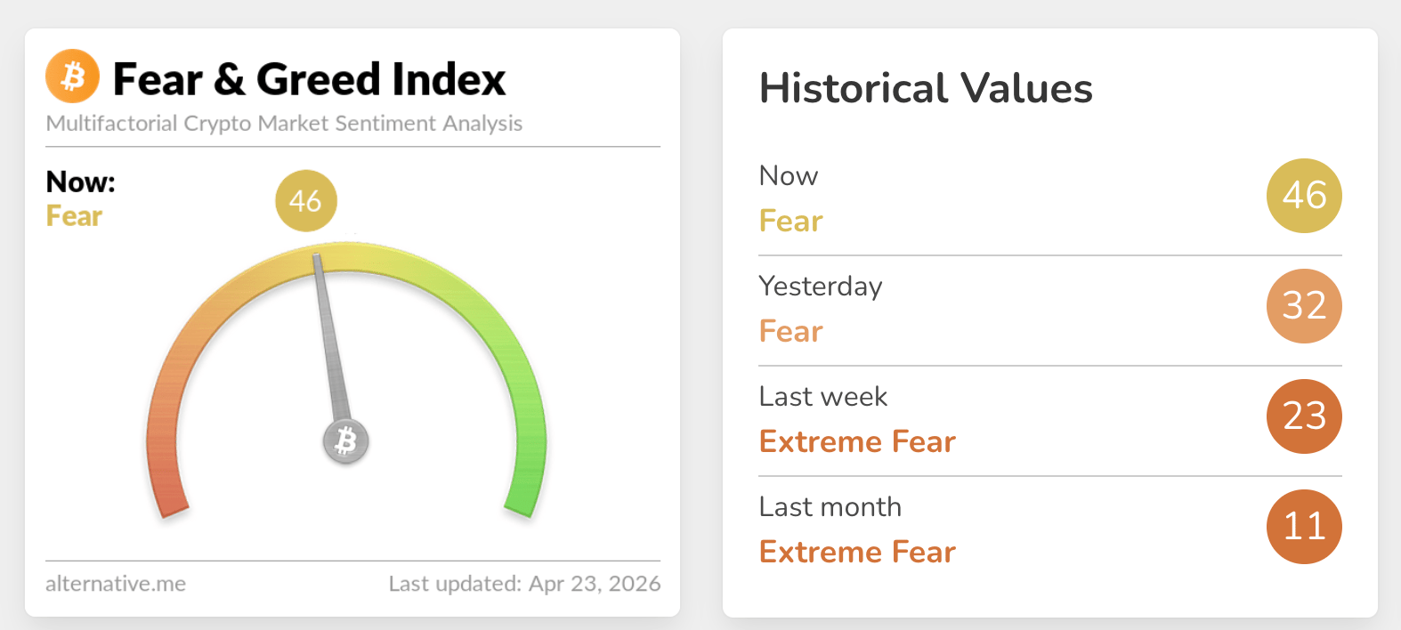 The XRP derivatives market has not shown signs of a significant turnaround despite sentiment improving to 46 in the fear territory on Thursday, up from 32 the previous day, according to the crypto Fear & Greed Index. Higher sentiment readings suggest an increasing appetite for crypto assets.