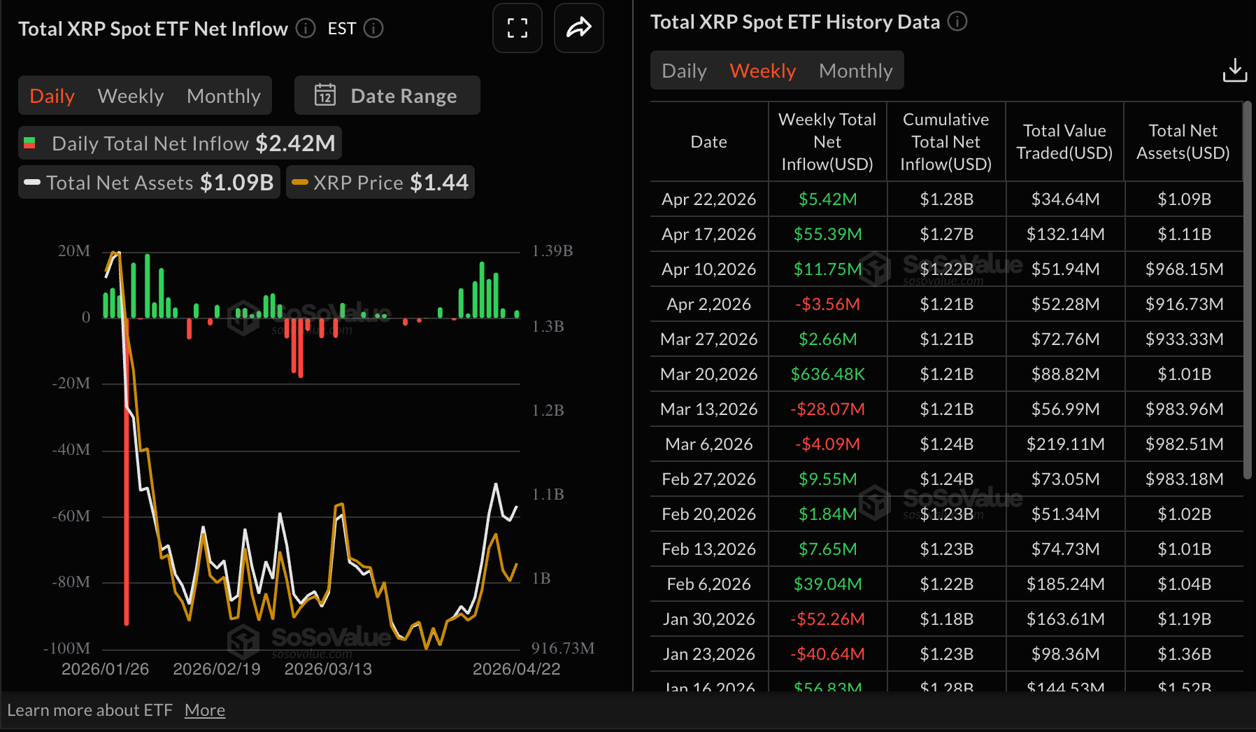 Inflows totaled $2.42 million on Wednesday, following muted activity the previous day. Meanwhile, cumulative inflows average $1.28 billion and total net assets $1.09 billion, according to SoSoValue data. Steady institutional demand is required to help shape sentiment and sustain XRP’s recovery.