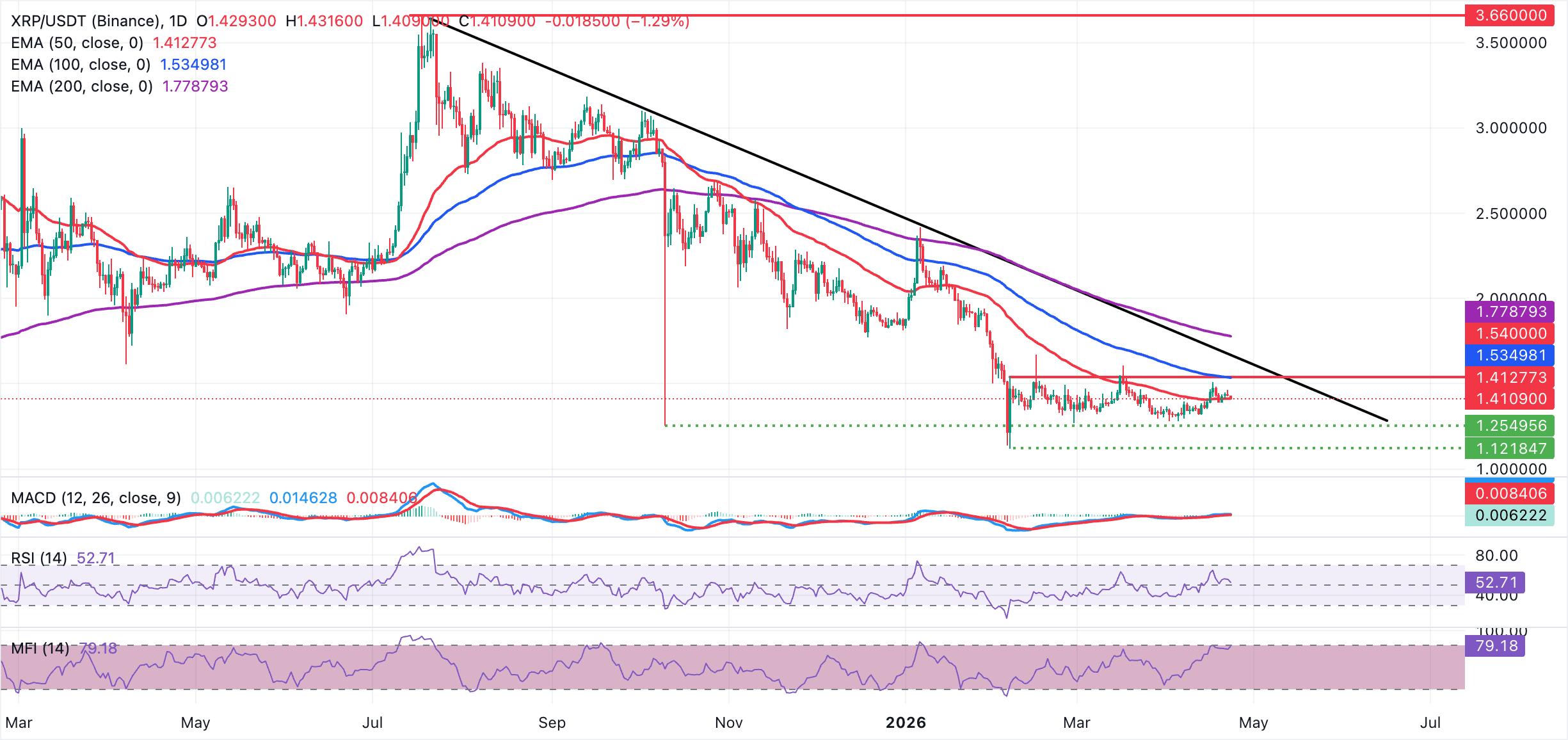 Ripple (XRP) is struggling to stay above support at $1.41 as of writing on Thursday, reflecting a broader correction in the crypto market. The remittance token was rejected at its weekly high of $1.46 on Wednesday, and is currently staring at a potential pullback below the pivotal $1.40 demand zone.