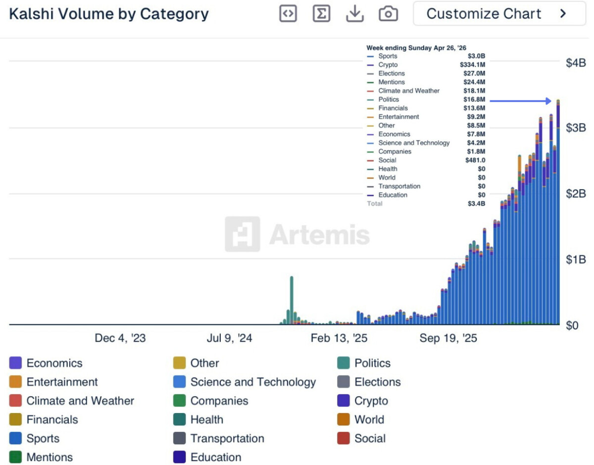 The week ending April 26 saw Kalshi processing $3.4 billion in trading volume according to data from Artemis. This marks a new all time high for the prediction market platform. The number that stands out however is not the total volume processed but rather the breakdown by category. Sports alone accounted for $3 billion or 88% of Kalshi’s entire weekly volume. This single category processed more volume than Polymarket’s total weekly volume by roughly $1 billion.