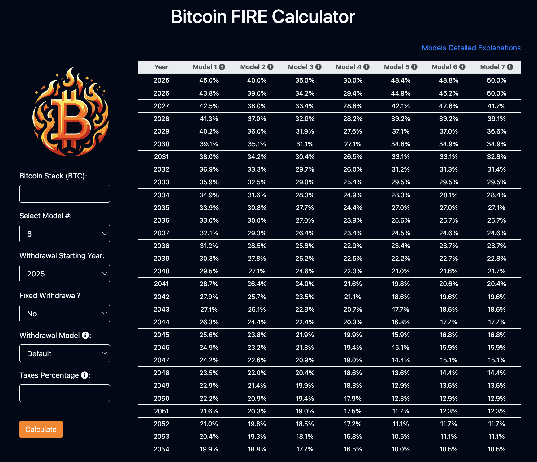 Complementing Battaglia’s approach, an analyst who goes by the pseudonym Hornet Hodl has developed a Bitcoin calculator inspired by the FIRE model used in traditional finance.