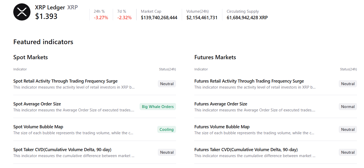 XRP’s spot markets show large whale orders and cooling conditions, with mostly neutral conditions across other metrics, suggesting a potential upside move.