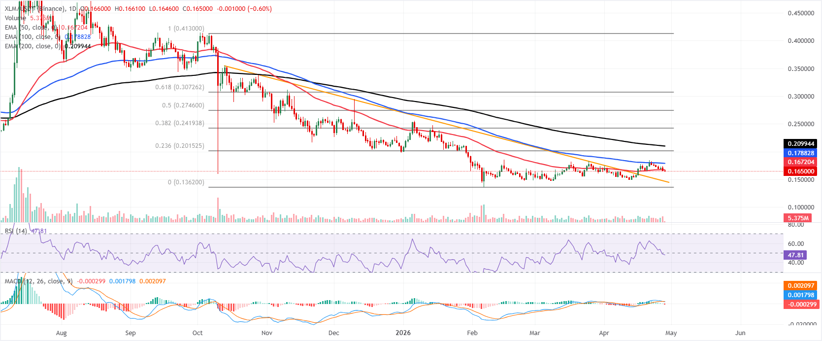 XLM price is trading at $0.165. Stellar remains under pressure as it holds below a stack of EMAs, with the 50-day EMA near $0.167, the 100-day EMA around $0.178 and the 200-day EMA close to $0.209, all acting as overhead supply.