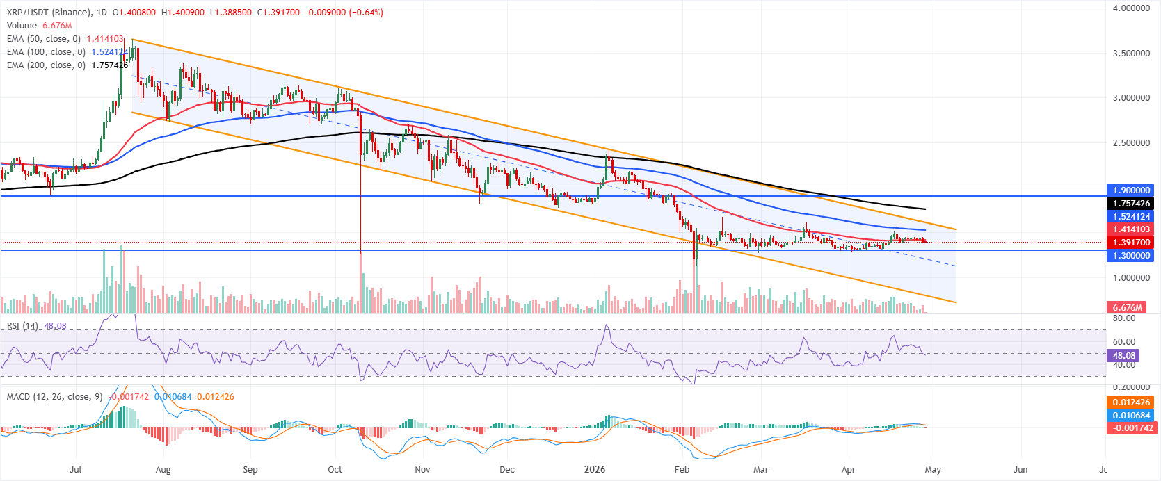 XRP price is trading below at $1.40, keeping a bearish bias as price holds below the 50-day Exponential Moving Average (EMA) at $1.41 and the 100-day EMA at $1.52, with the 200-day EMA further overhead at $1.75.