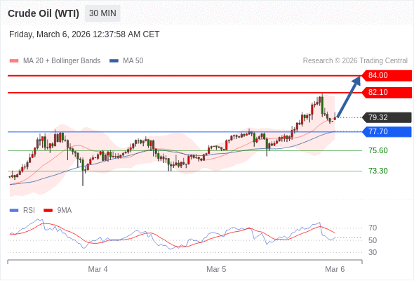 在 77.70 之上,看涨,目标价位为 82.10 ,然后为 84.00 。