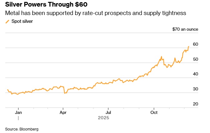 周二(12月9日),现货白银价格首次突破60美元/盎司大关,交易员押注美联储将进一步放松货币政策,同时供应持续偏紧,这刺激银价暴涨。