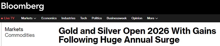 2026年首个交易日开始后,贵金属市场开盘出现大涨行情。美国彭博社称,黄金和白银在2026年的交易开局走强,此前在2025年,金银都创下自1979年以来最佳的年度表现。
