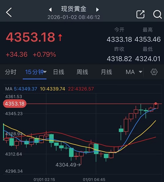 现货黄金周五(1月2日)跳空高开近15美元,随后金价进一步走强,亚市早盘金价触及4353美元/盎司水平,日内大涨近35美元。