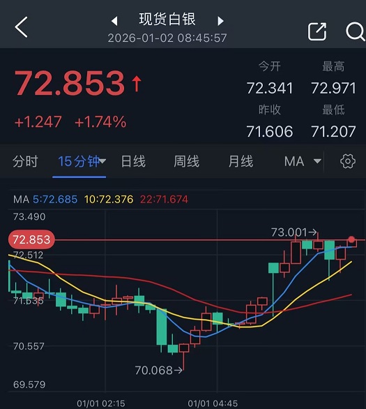 现货白银也大涨约2%,银价最高触及73.00美元/盎司。