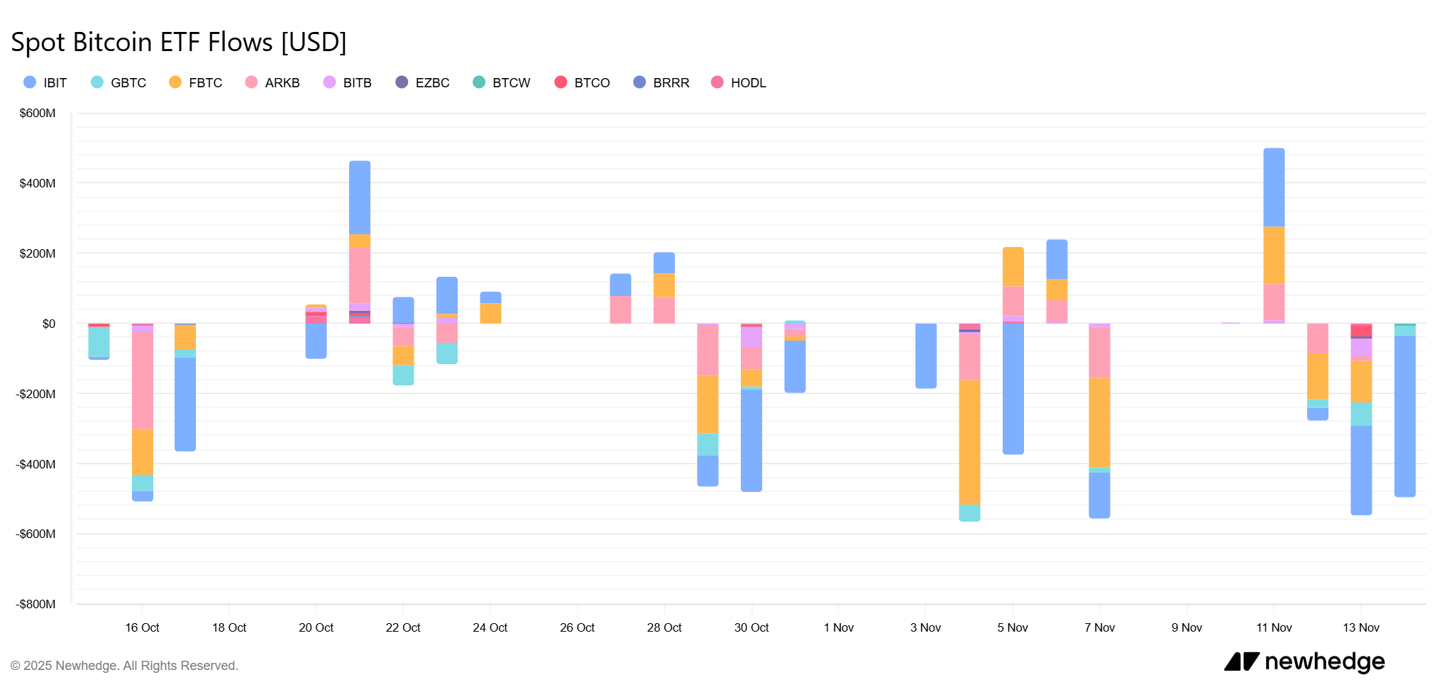 事实上,比特币 ETF 的数据反映出机构兴趣的下降。截至 11 月 14 日,资金流出总额接近 5 亿美元,连续第三个交易日录得净流出。这表明机构参与度显著减弱,需求下降从而在短期内加剧卖压。