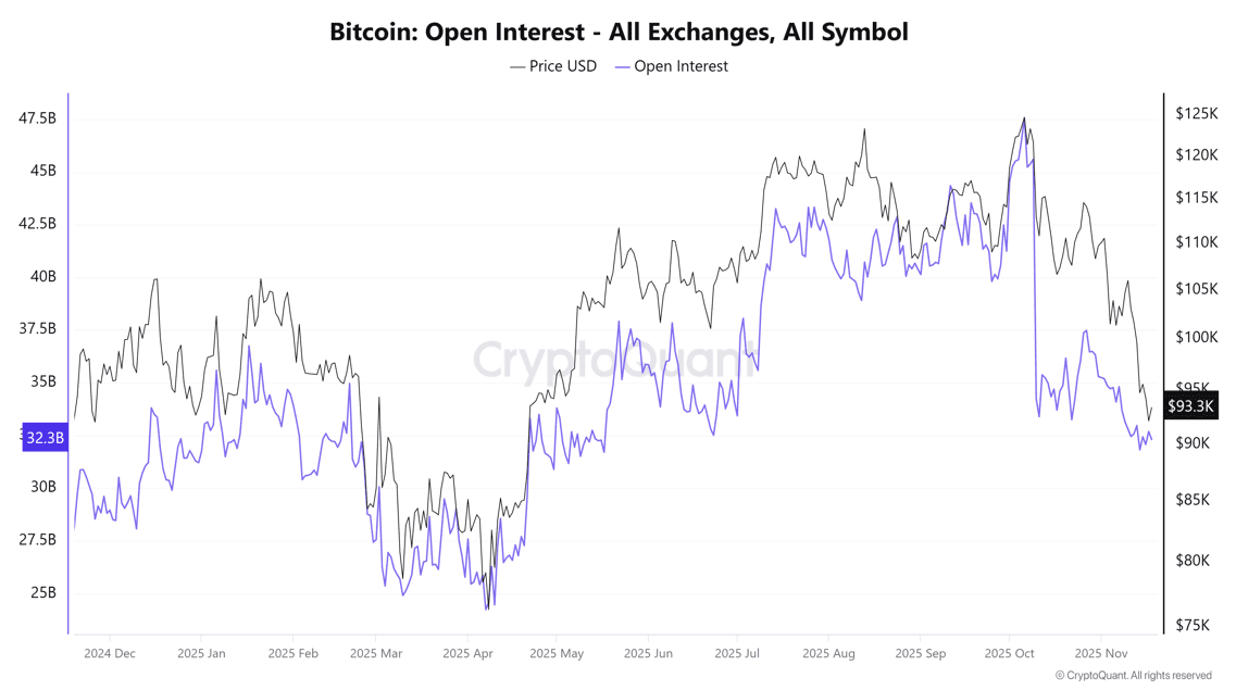 与此同时,比特币市场的未平仓合约指标持续下跌,已连续数周下降,目前约为 323 亿美元 —— 属于 2025 年最明显的下行阶段之一。未平仓合约衡量多头与空头的总持仓量,其与价格同步下跌表明多头持续离场,反映投资者缺乏兴趣或正在获利了结,导致过去数周市场需求表现疲弱且分散。