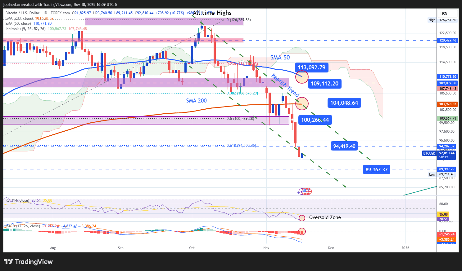 代表最新低点,同时也是跌破90,000 心理关口后的重要支撑。若跌破此位,可能加速下行趋势,引发更具攻击性的短期看跌阶段。