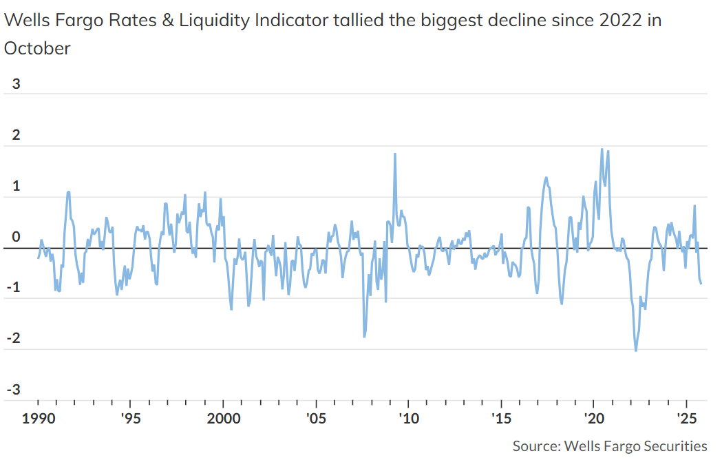 富国银行的指标由多项数据构成,其中两项在10月表现尤为突出:美国银行体系储备下降,以及隔夜担保融资利率与联邦基金利率之间的利差扩大。这两项都表明借款人为了维持日常运营,正在支付更高成本。