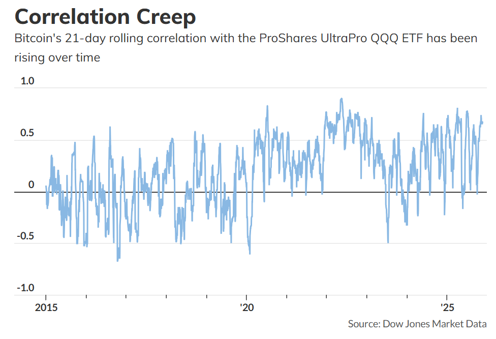 数据也支持这一观点:根据道琼斯市场数据,比特币与ProShares UltraPro QQQ之间的21天滚动相关性本周达到0.7,而TQQQ是追求纳斯达克100指数日波动三倍放大的产品。