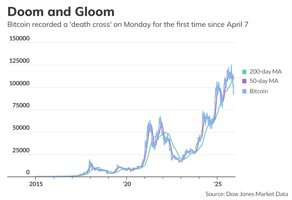 根据道琼斯市场数据,周一比特币出现“死亡交叉”。所谓死亡交叉,是指50日均线下穿200日均线,通常预示着某项资产或指数的中期趋势发生逆转。尽管名称听上去不祥,但数据显示死亡交叉往往意味着资产已跌得过头,即将出现反弹。