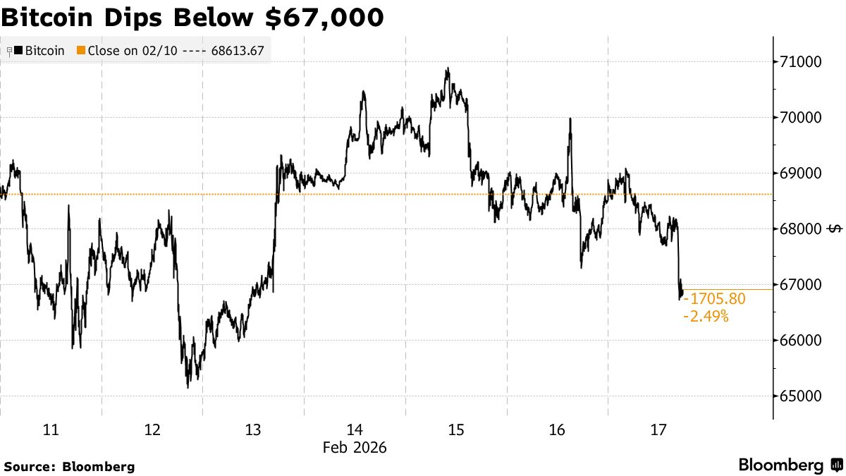 周三(2月18日)比特币继续在7万美元关口下方震荡,在更广泛的市场波动背景下,投资者担忧人工智能对经济的影响,比特币延续了为期四周的跌势。