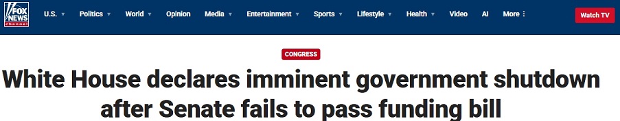美国福克斯新闻报道称,在美国参议院未能通过共和党支持的、旨在维持联邦机构运营至11月21日的支出法案后,白宫已正式宣布政府即将陷入停摆。