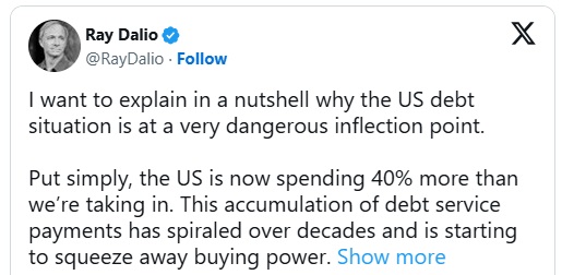 达利欧发出上述警告之际,人们对美国债务水平上升、通胀压力以及政府支出的可持续性普遍感到担忧。