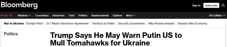 特朗普说:“他们想看到‘战斧’朝他们的方向飞去吗?我不这么认为。我觉得我可能会就此事与俄罗斯谈谈,这样才公平。”