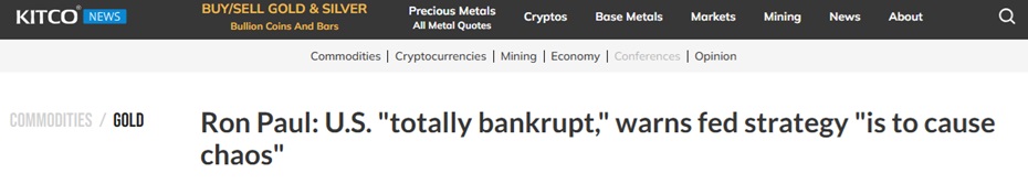 FX168财经报社(亚太)讯 美国政坛大佬、前国会议员罗恩·保罗(Ron Paul)宣称,美国“在道德和财政上完全破产”,并在接受Kitco News的广泛采访时表示,国家的1.9万亿美元赤字是一个“债务螺旋”,最终将“用虚假货币偿还”,公民应“为即将发生的重大事件做好准备。”